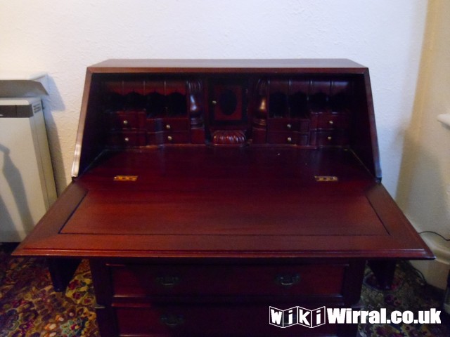 We have a very nice Bureau Desk in dark wood for sale. It has five drawers, three large and two smaller. Writing leaf. Hidden drawers and fourteen internal drawers.