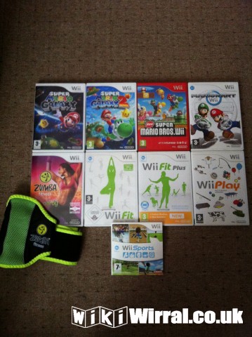 4 in 1 sports pack wii balance board wii balance board rechargable battery pack and charger wii fit wii fit plus zumba fitness party and belt super mario galaxy 1+2 Mario cart and wheel Super mario bros. wii play wii sports 2 normal rechargable controllers charging station for controllers 2 knuncucks 1 blue wii motion plus controller 1 pink wii motion plus controller