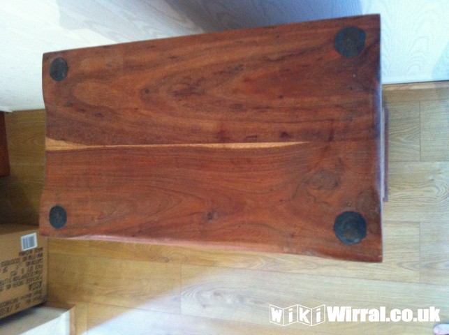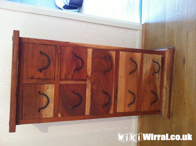 Solid wood. Showing signs of wear yet still lovely. Has a small spillage of nail polish in one of the drawers and could do with a clean.